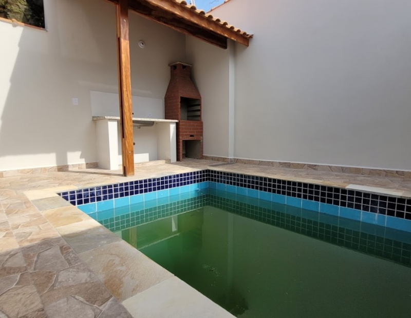 Piscina com cascata, churrasqueira e área de serviço.